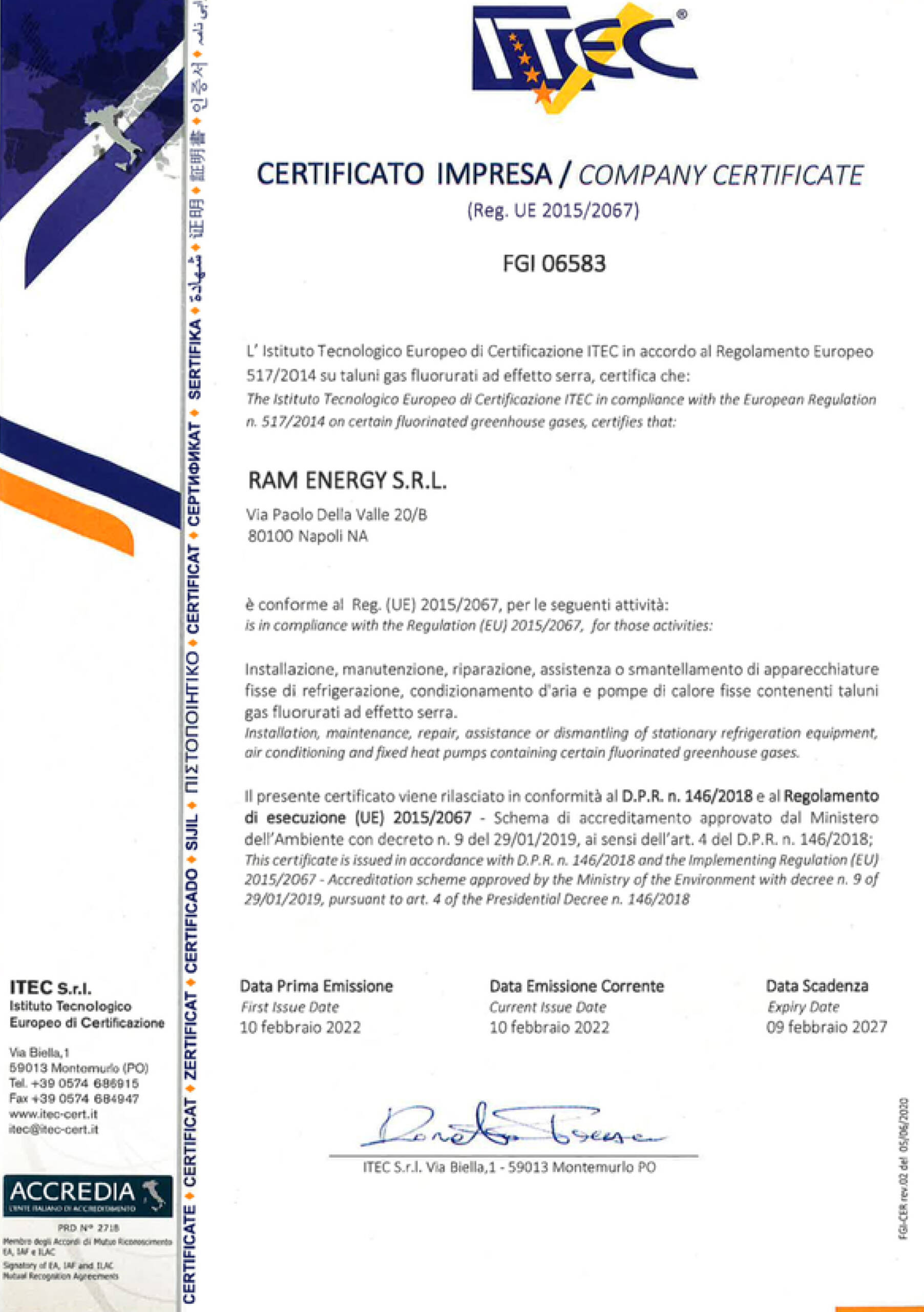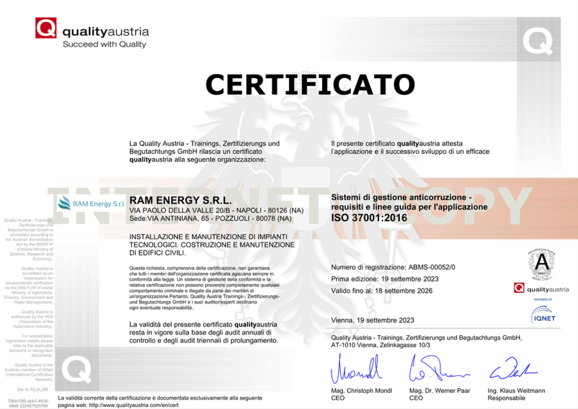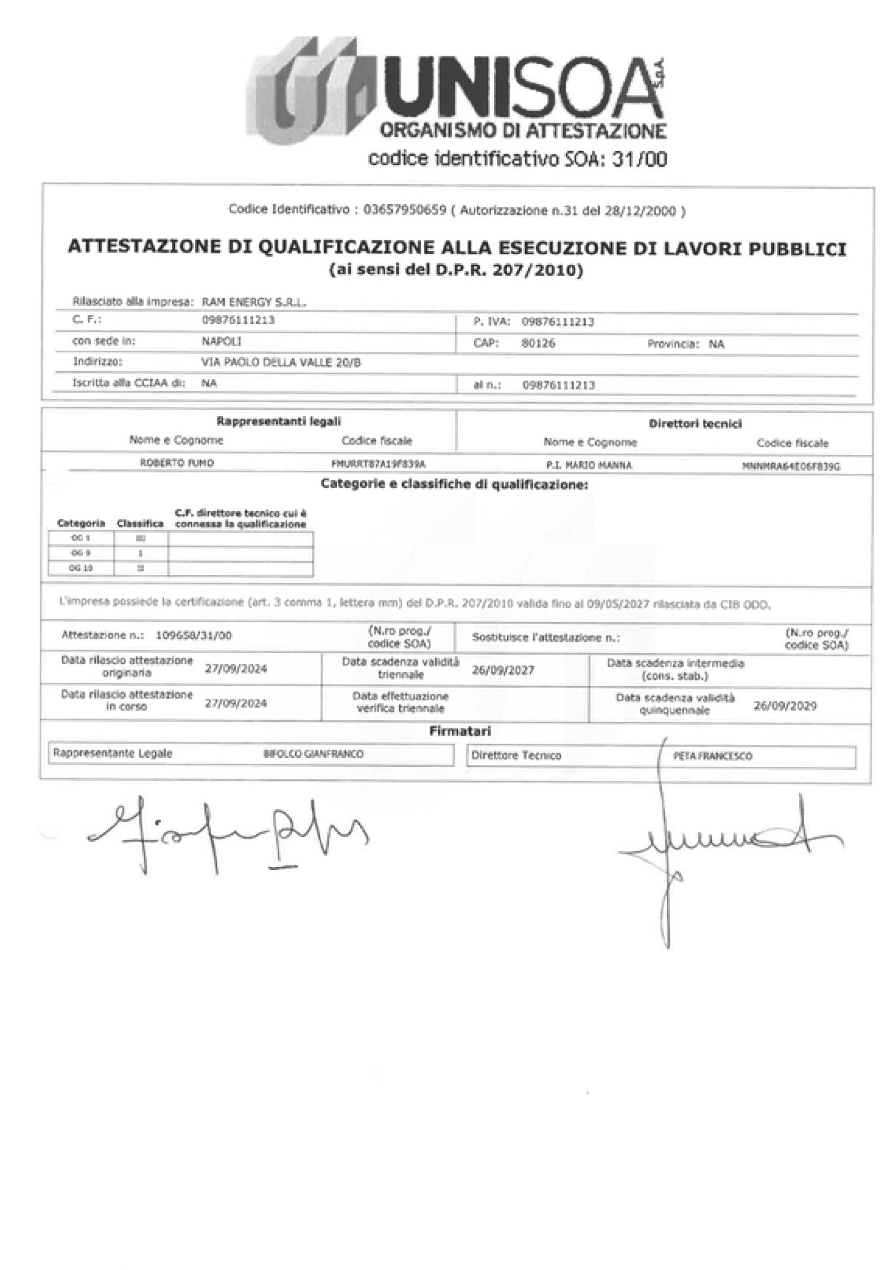 La nostra azienda vanta una solida reputazione nel rispetto degli standard internazionali, testimoniata dalle certificazioni ISO 9001:2015 per il sistema di gestione per la qualità, ISO 14001:2015 per il sistema di gestione ambientale, ISO 37001:2016 per il sistema di gestione anticorruzione, ISO 45001:2018 per il sistema di gestione per la salute e la sicurezza sul lavoro, Attestazione ITEC per le competenze tecniche specifiche e Attestazione SOA per l'esecuzione di lavori pubblici. Queste certificazioni riflettono il nostro impegno continuo verso l'eccellenza, la sostenibilità e la conformità alle normative internazionali, garantendo ai nostri clienti un servizio di alta qualità, sicuro e responsabile.